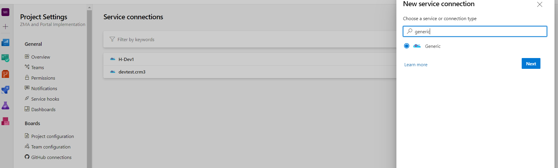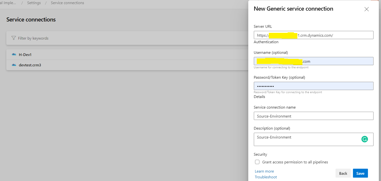 Now if you go back to the Build Pipeline tab and only refresh the Service Connection drop down you should be able to see the above connection you just have created and you can select it for all the tasks.