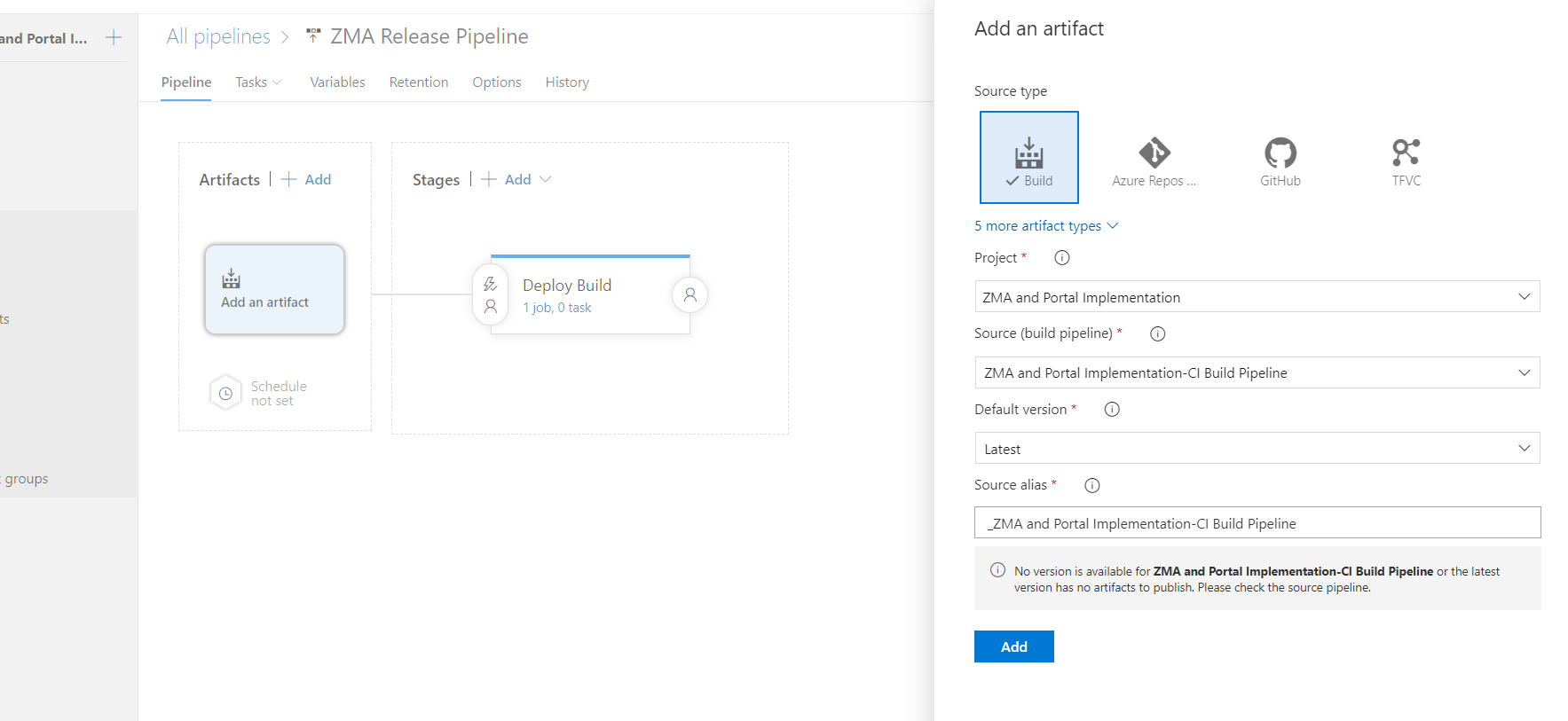 - Add an artifact, select the same project and in source select the above created Build Pipeline.