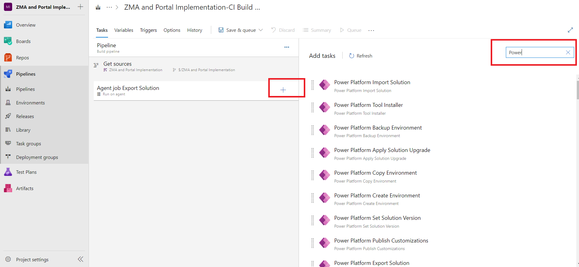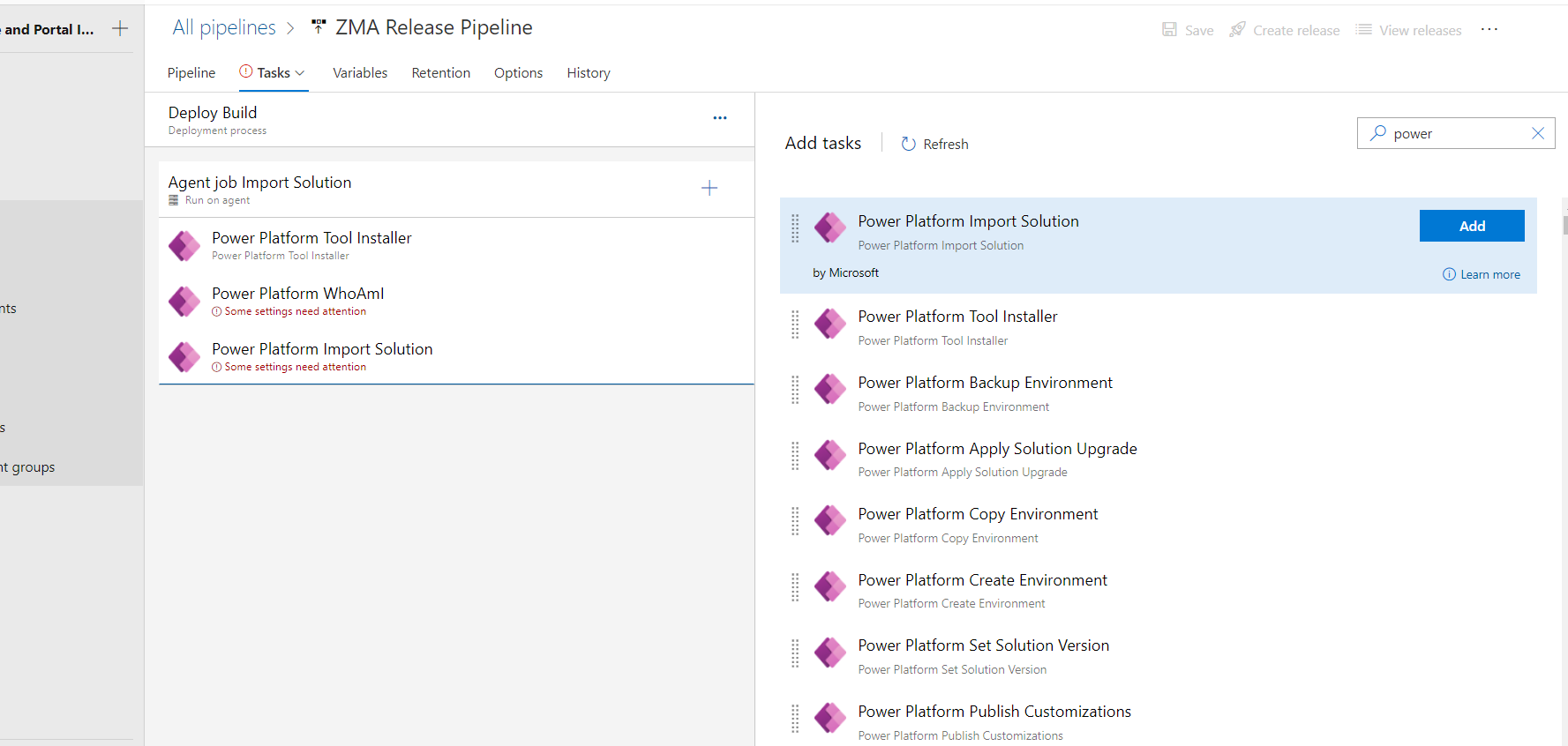 Note: If “Power platform Tools” is not already installed in your environment, you will get the option to download it from “Marketplace” for free. - Add the following tasks