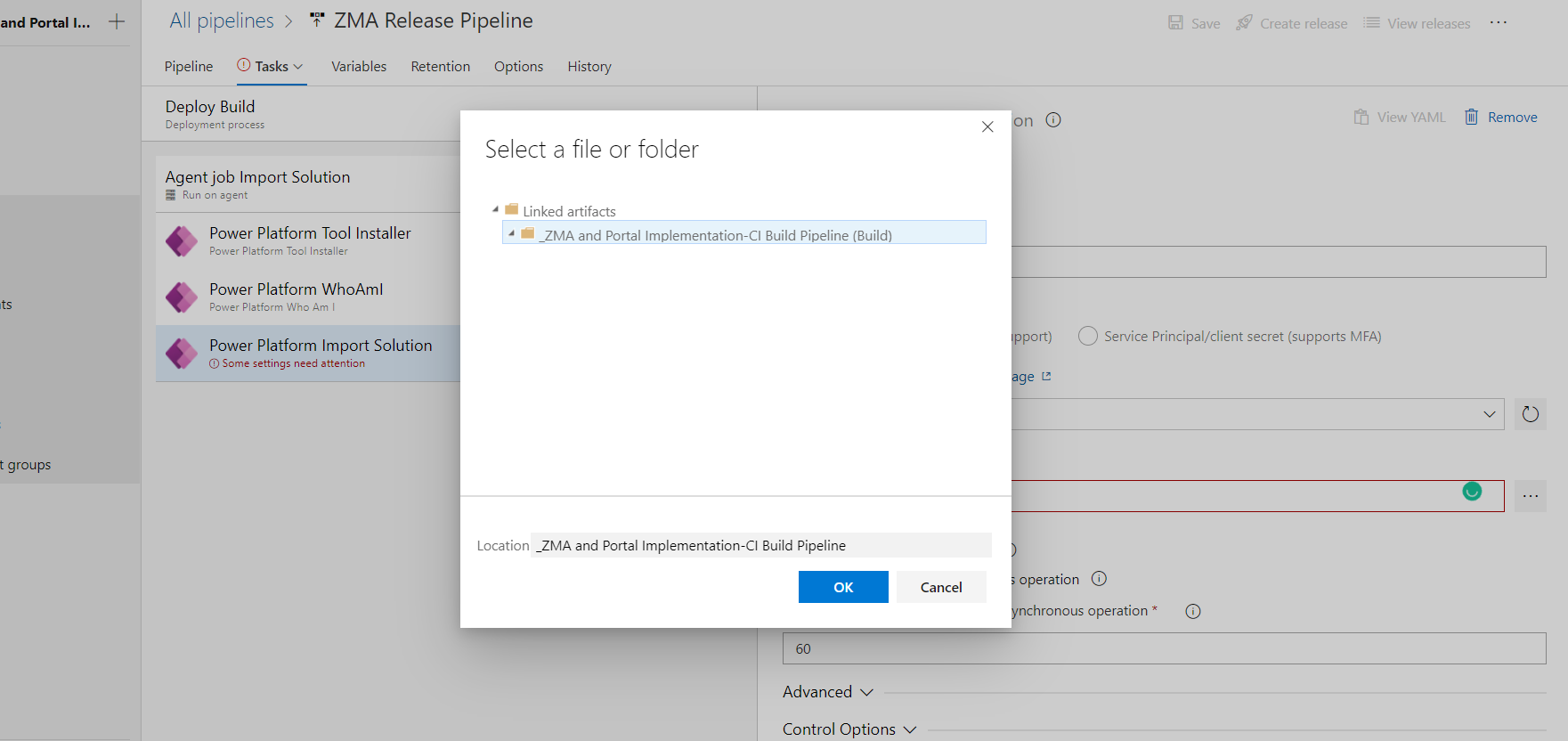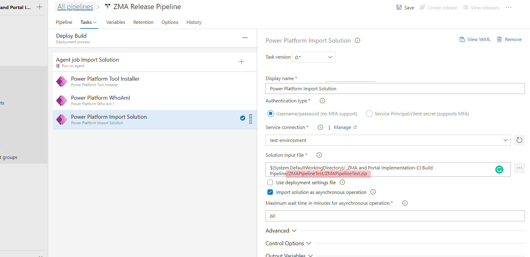 - In import solution task, for service connection I have created the new connection for test environment and select it here and for solution output file select the linked artifacts of build pipeline.