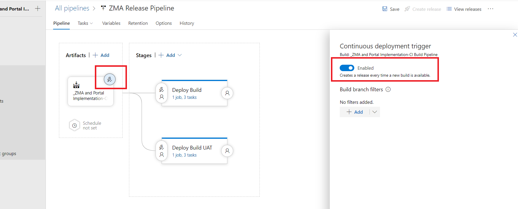 Note: If you want to deploy the build only in one environment you can can skip the above point no 7. - Now in the pipeline tab, select the “continuous deployment trigger” icon and click Enabled. This will automatically trigger the Release pipeline after the build pipeline is run.