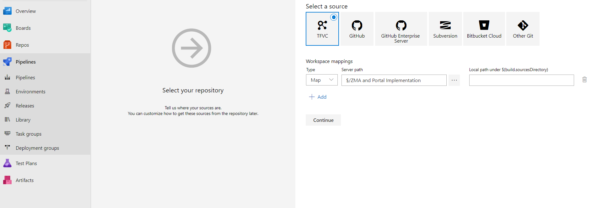 - Now you need to select TFVC/Repository although I won’t be using any repository in our Pipeline but this is the mandatory step to move forward but you can use TFVC/Repository to save your solution on the server for the backup if you want.