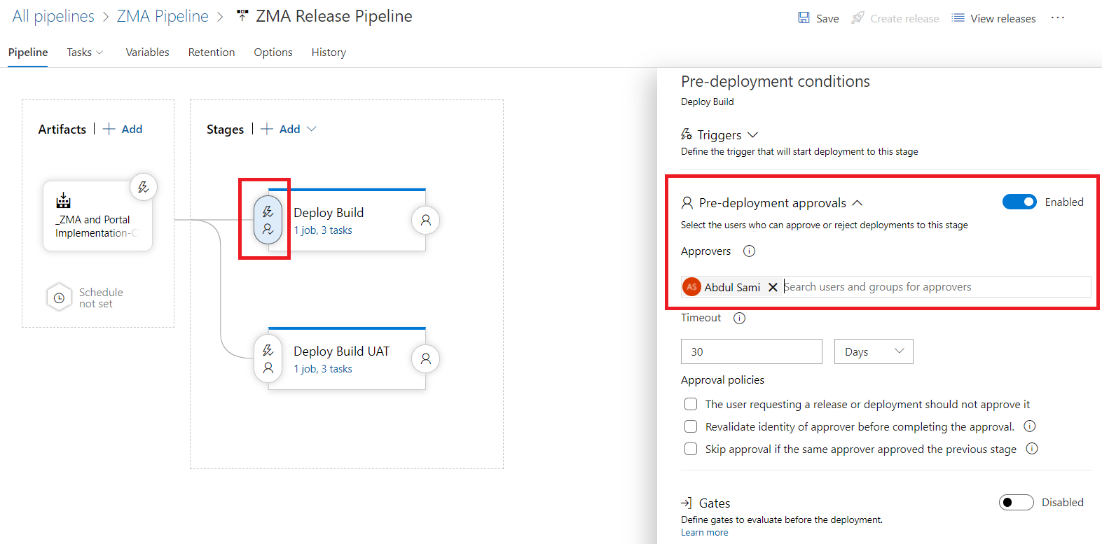 - Now I have added the “Pre-deployment approvals” for one environment (stage) because as we know this is the automated process but we can keep control of the deployment for any specific environment because sometimes approvals are required from the environment owners or higher management.