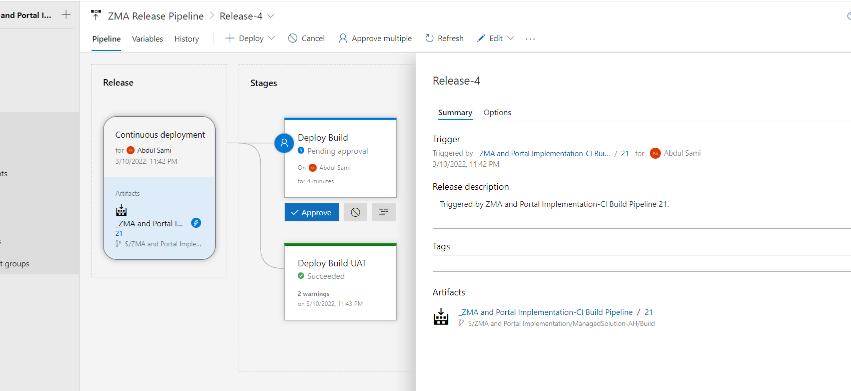 I have a solution in Dev environment and I want to deploy this solution in our two test environments as a managed, For one environment I have added a Pre-deployment Approval.